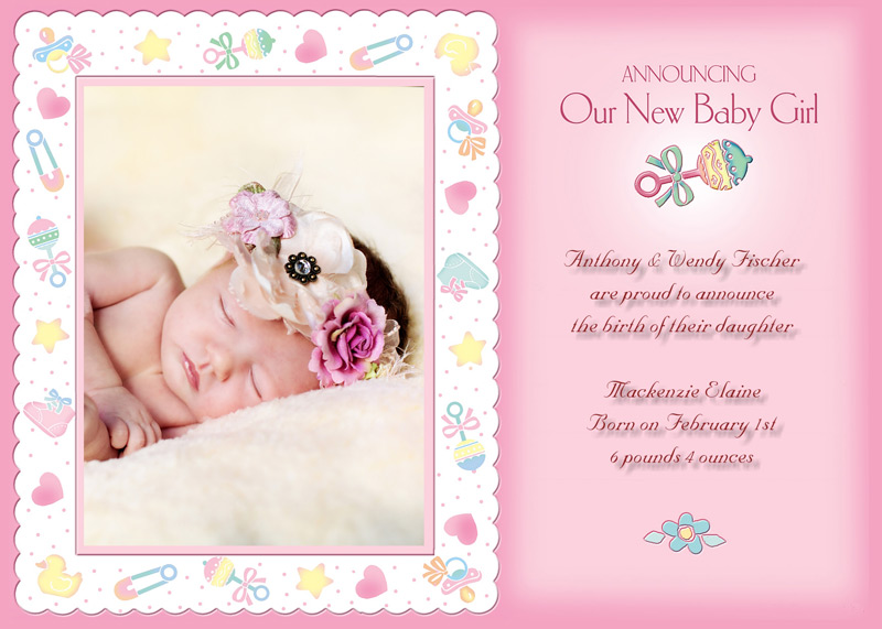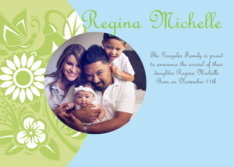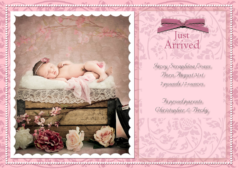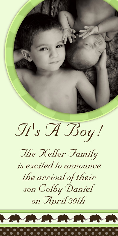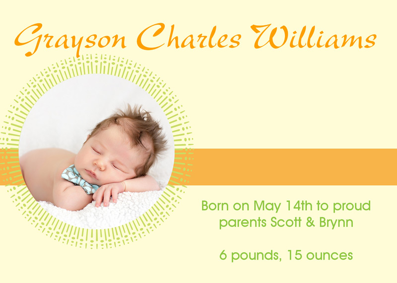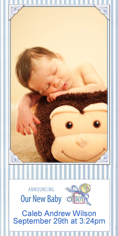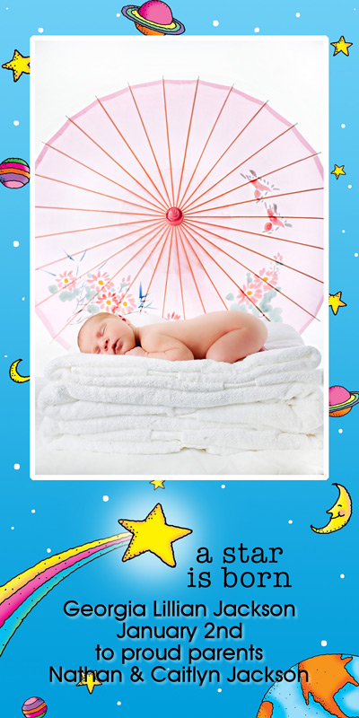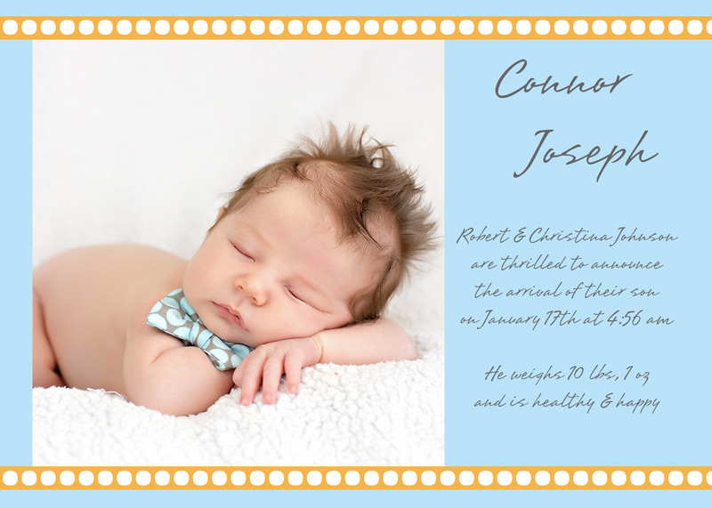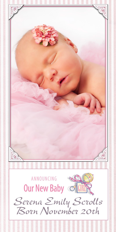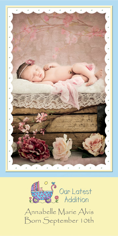 Get The DetailsDesigns include 4x8 Slimline Greetings and 5x7 Cards, in your choice of horizontal and vertical formats. Birth Annoucements Cards on Professional Papers are single-sided and can be personalized with your own text.
