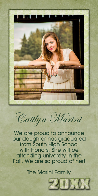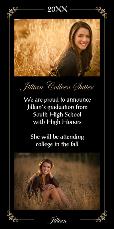 Get The DetailsDesigns include 4x8 Slimline Greetings and 5x7 Cards, in your choice of horizontal and vertical formats. Graduation Cards on Professional Papers are single-sided and can be personalized with your own text.