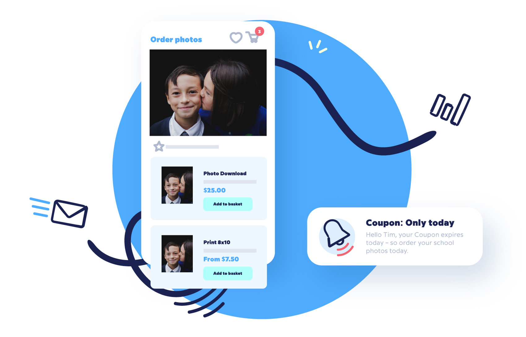 Create and send your customers automated email and text messages to notify them when their photos are ready online - and for reminders to purchase. No more forgotten order slips!