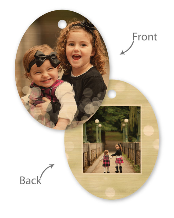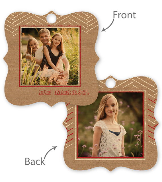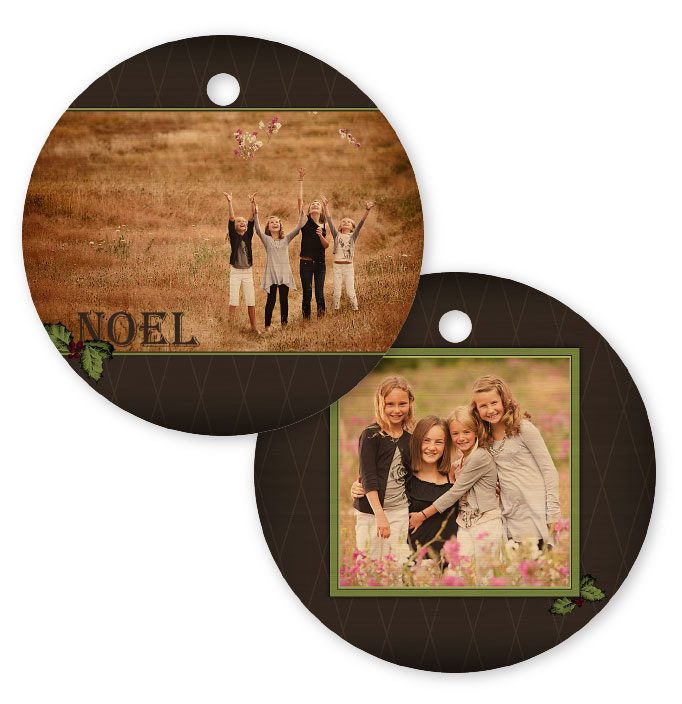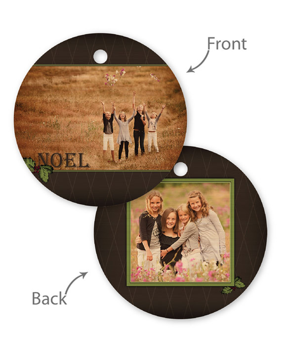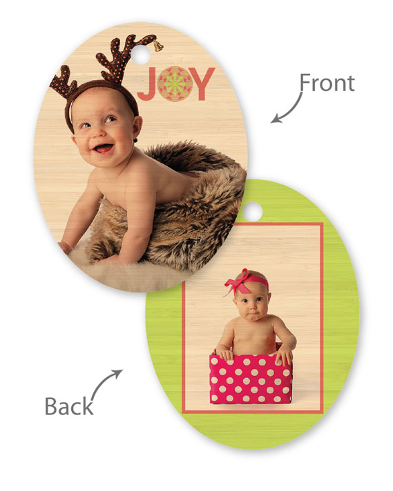 Double-sided Bamboo Photo Ornaments are sold individually and include twine for hanging.