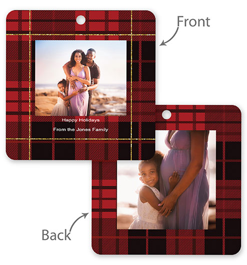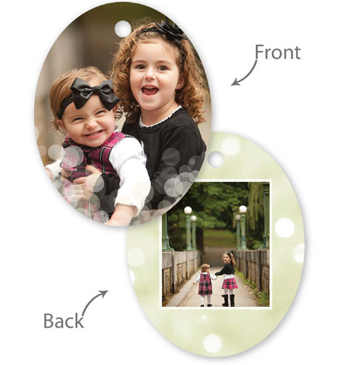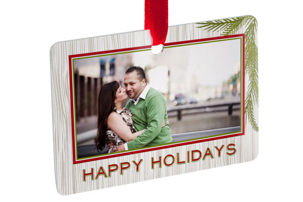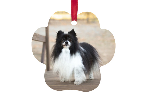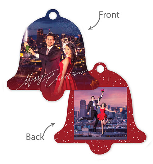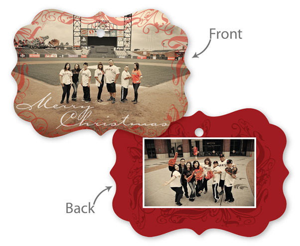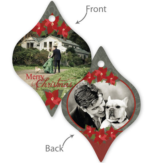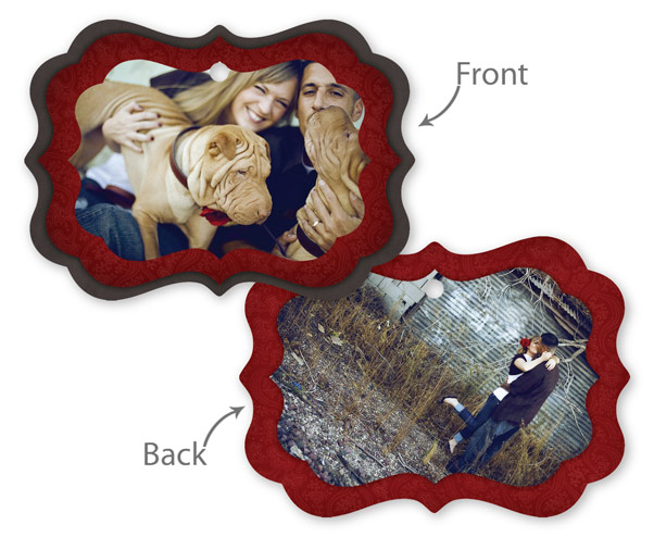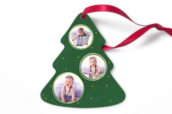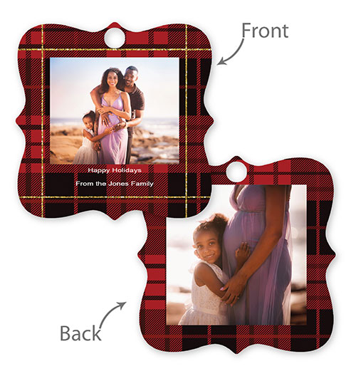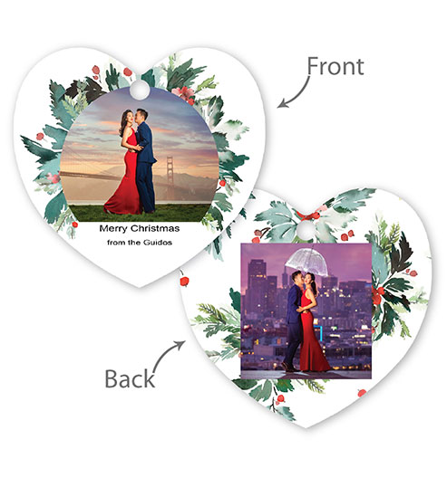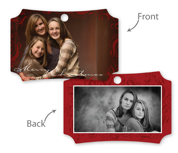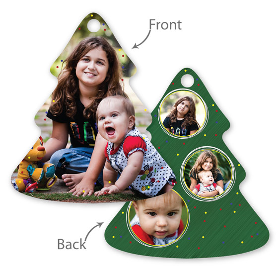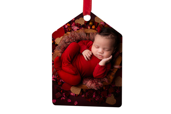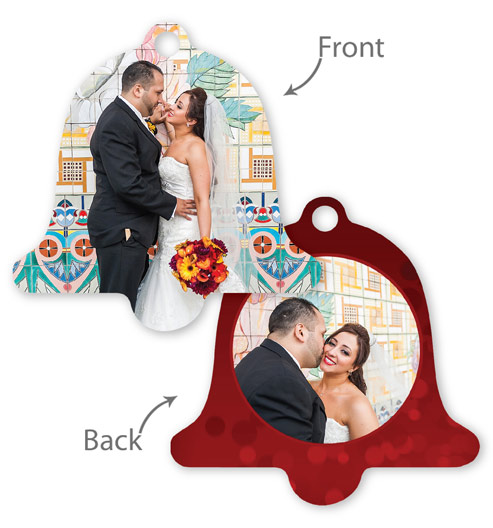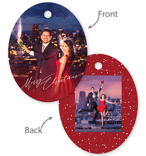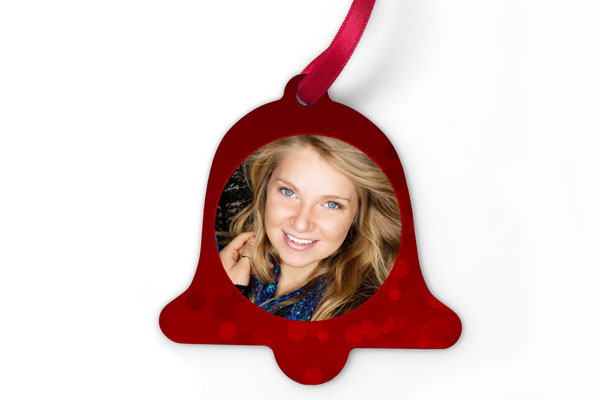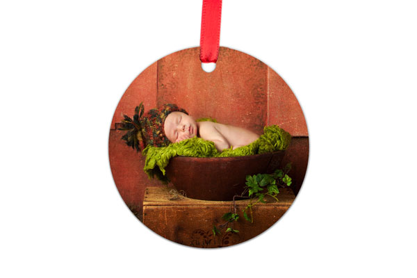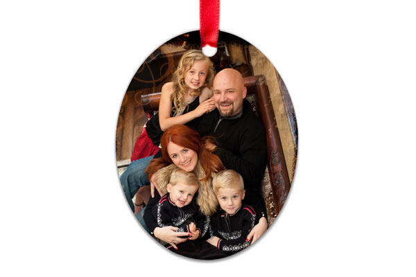Double-sided Metal Print Photo Ornaments are sold individually and include a red ribbon for hanging.