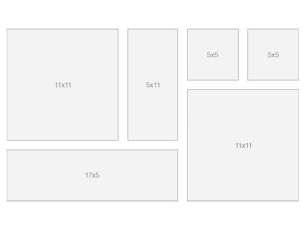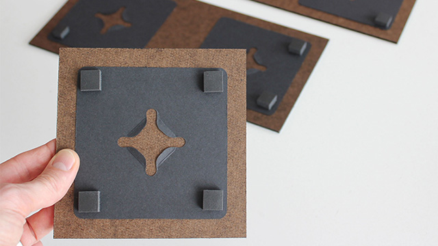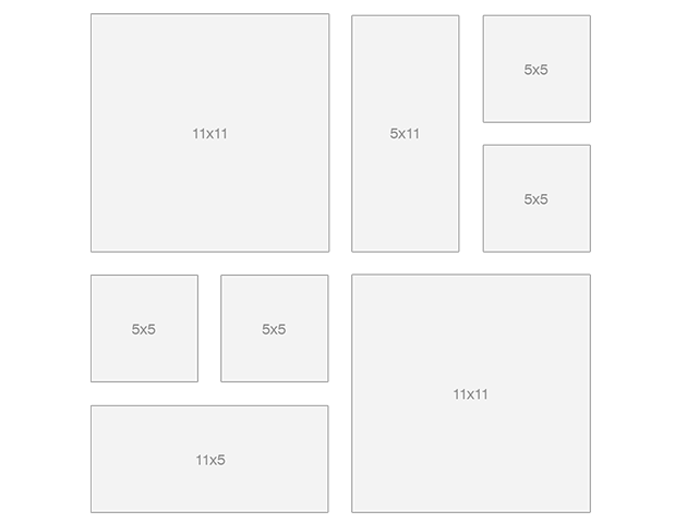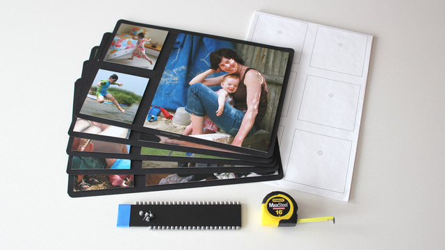 Push-in pegs form a grid that aligns and holds the panels tight. The eight panel sizes fit together into perfect collages with 1" spacing in between.